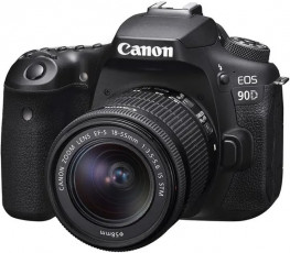 - Myyntipakkauksen sisältö: EOS 90D kamerarunko, akku, akkulaturi, 18-55 mm objektiivi, kaulahihna.